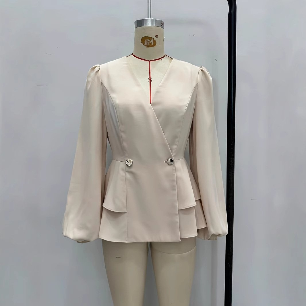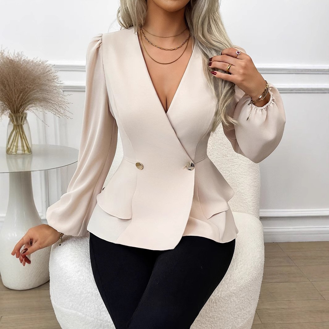 Cross-collar lotus leaf hem solid color long sleeve top business fashion neck lantern sleeve shirt for women