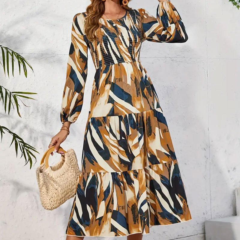 Elegant long-length skirt with a ruffled slim waist and waist long-sleeved vacation commuter dress