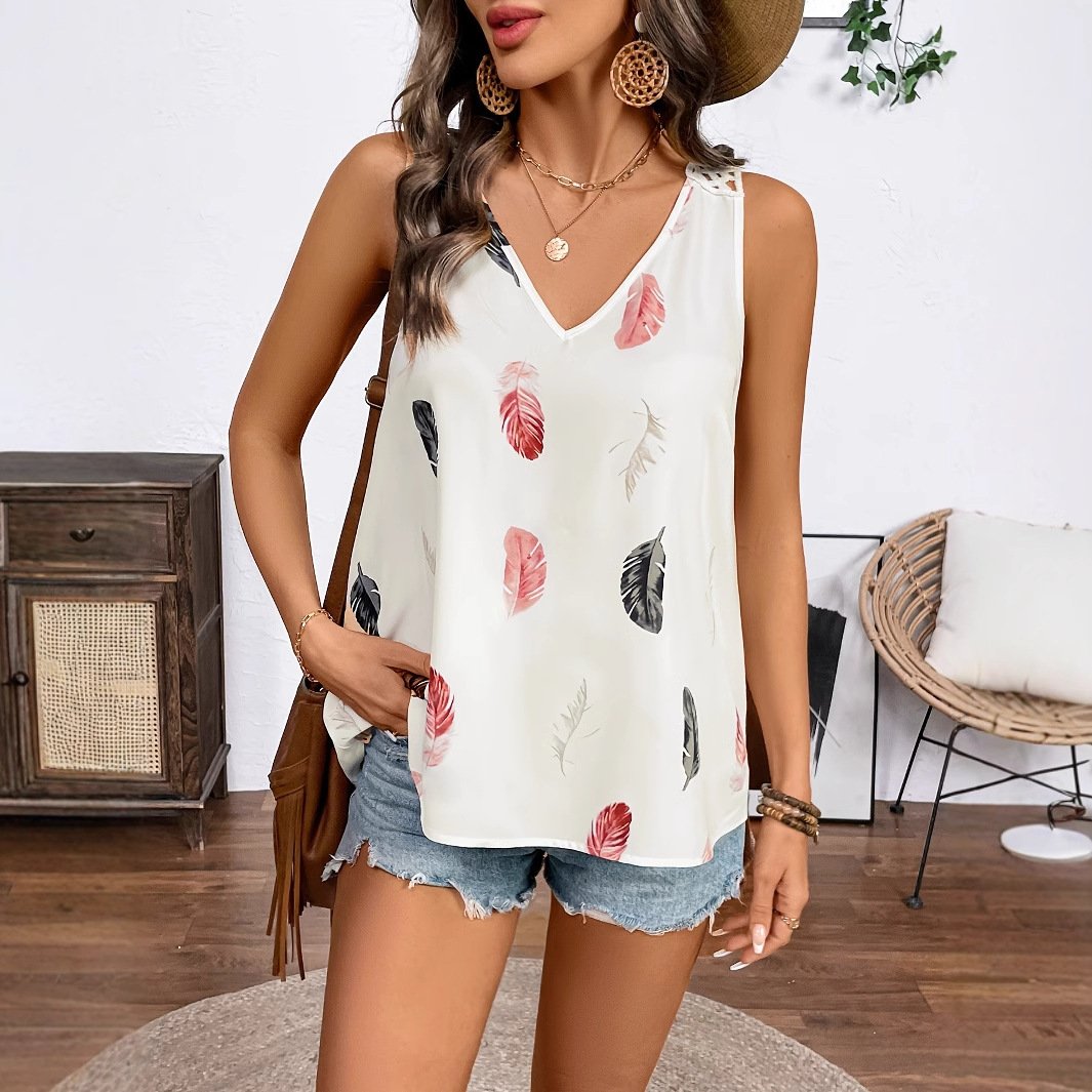Be the first to review “Extended collar vest feather silhouette printed lace hollow women’s vacation sleeveless top”