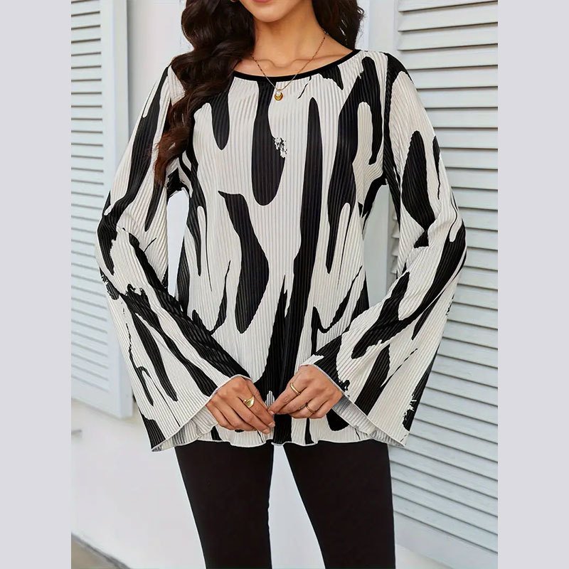 pleated printed flared sleeves long sleeve top for women loose round neck shirt for women