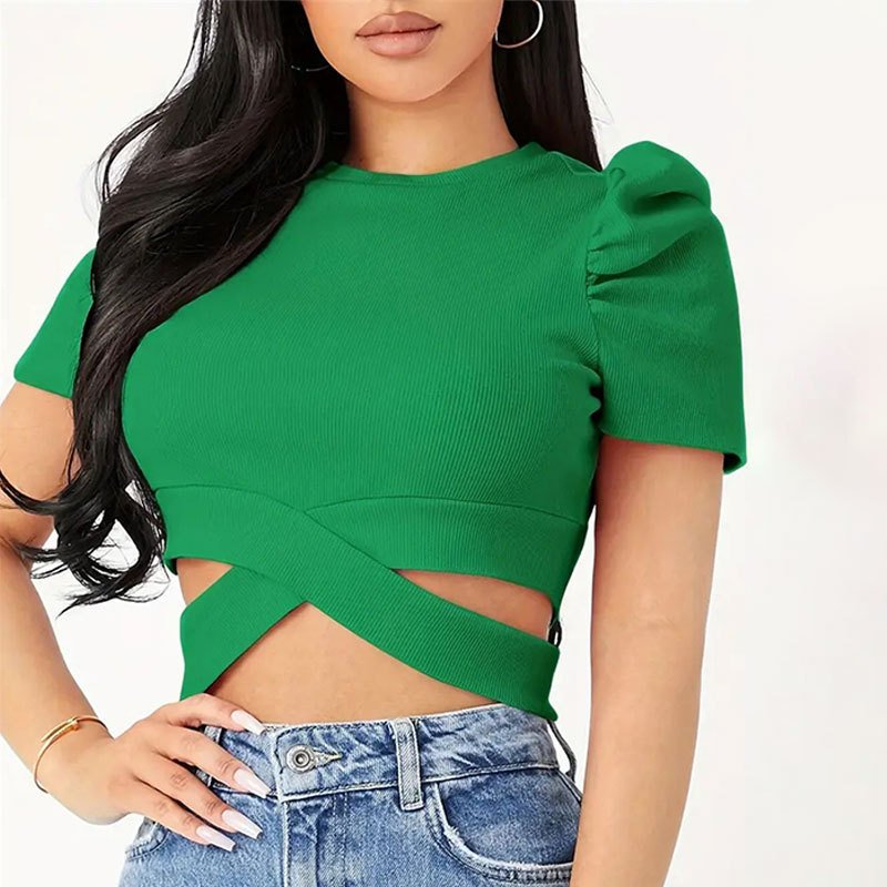 Round neck puff sleeves short top with navel exposed female knitted shirt for women