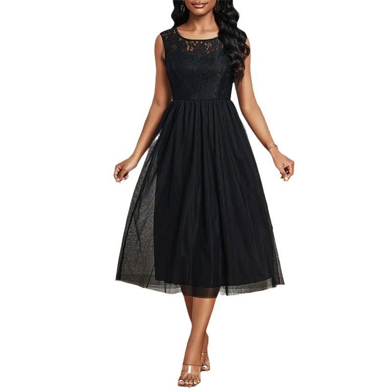 Skirt Lace mesh spliced transparent round neck sleeveless dress skirt long high-end women’s clothing