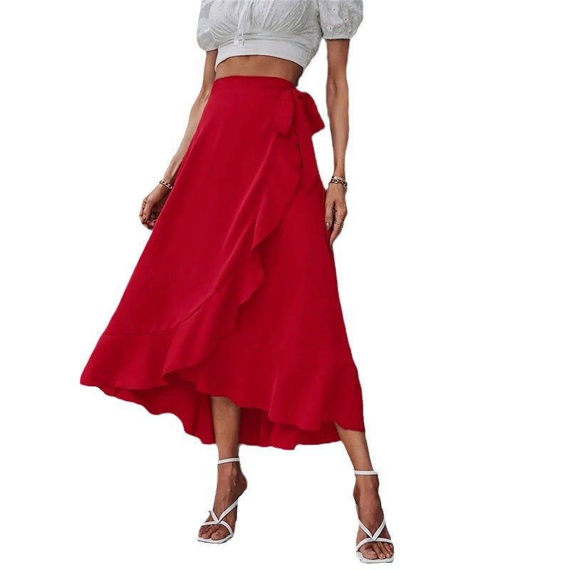 Strap-up ruffled irregular long skirt high-end solid color skirt women’s clothing