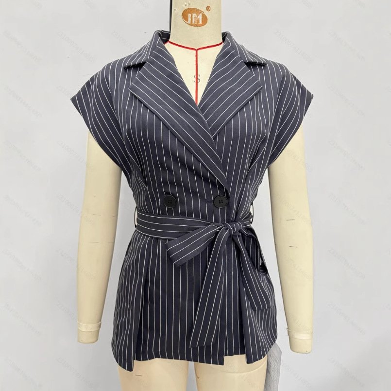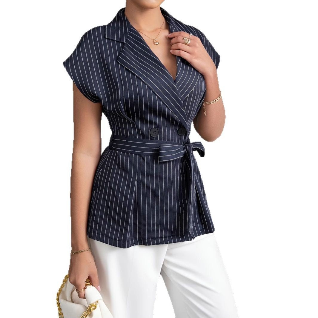 Temperature lapel open-clad short-sleeved suit jacket, double-breasted strap waist-hugging design, fashionable shirt for women