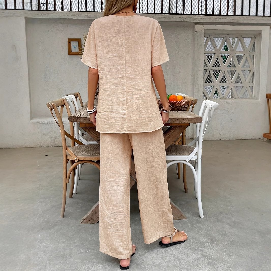 | feature | Literary solid color pullover round neck T-shirt loose pants suit |