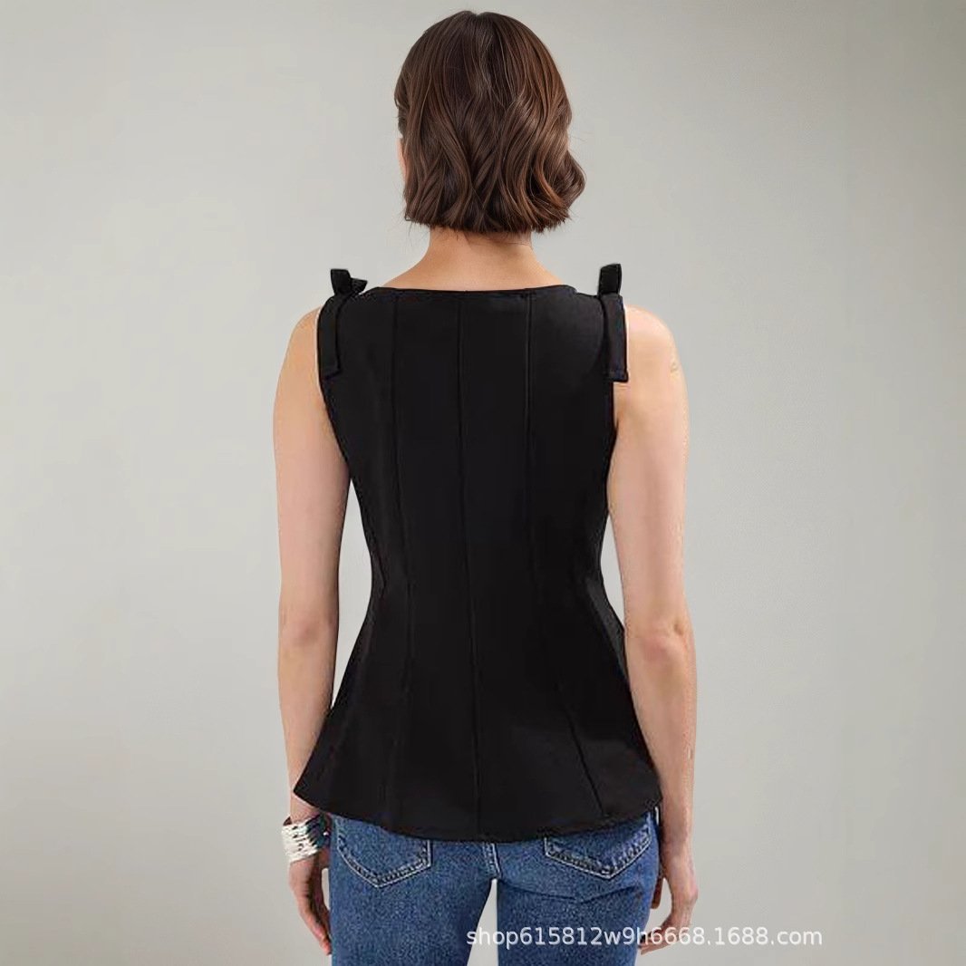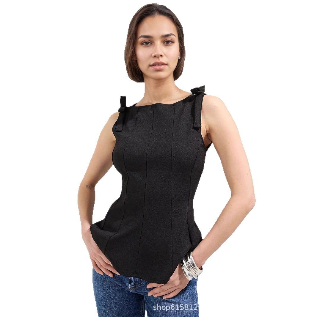 Women’s clothing Black women’s shirt sleeveless ruffle waist shirt bow knitted top