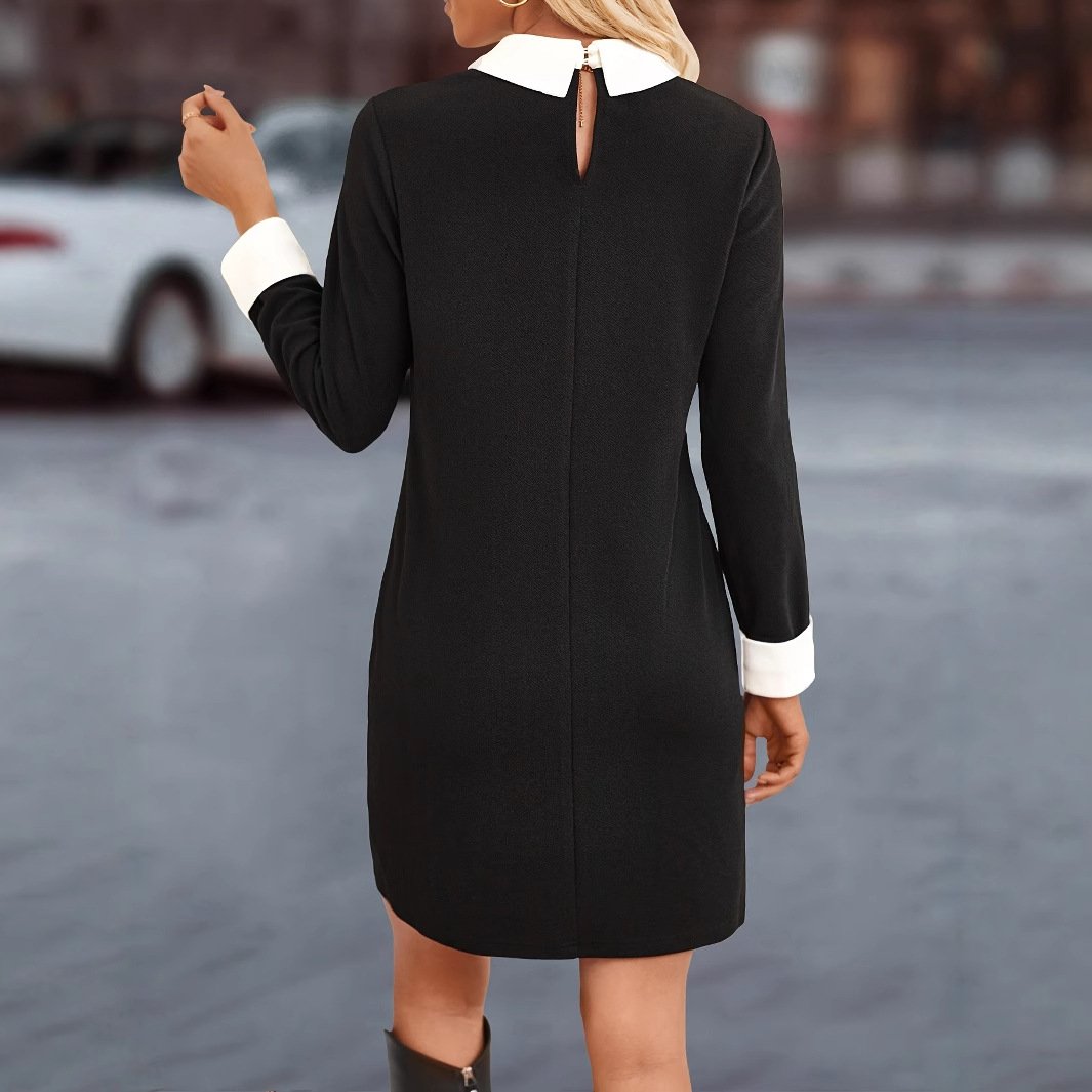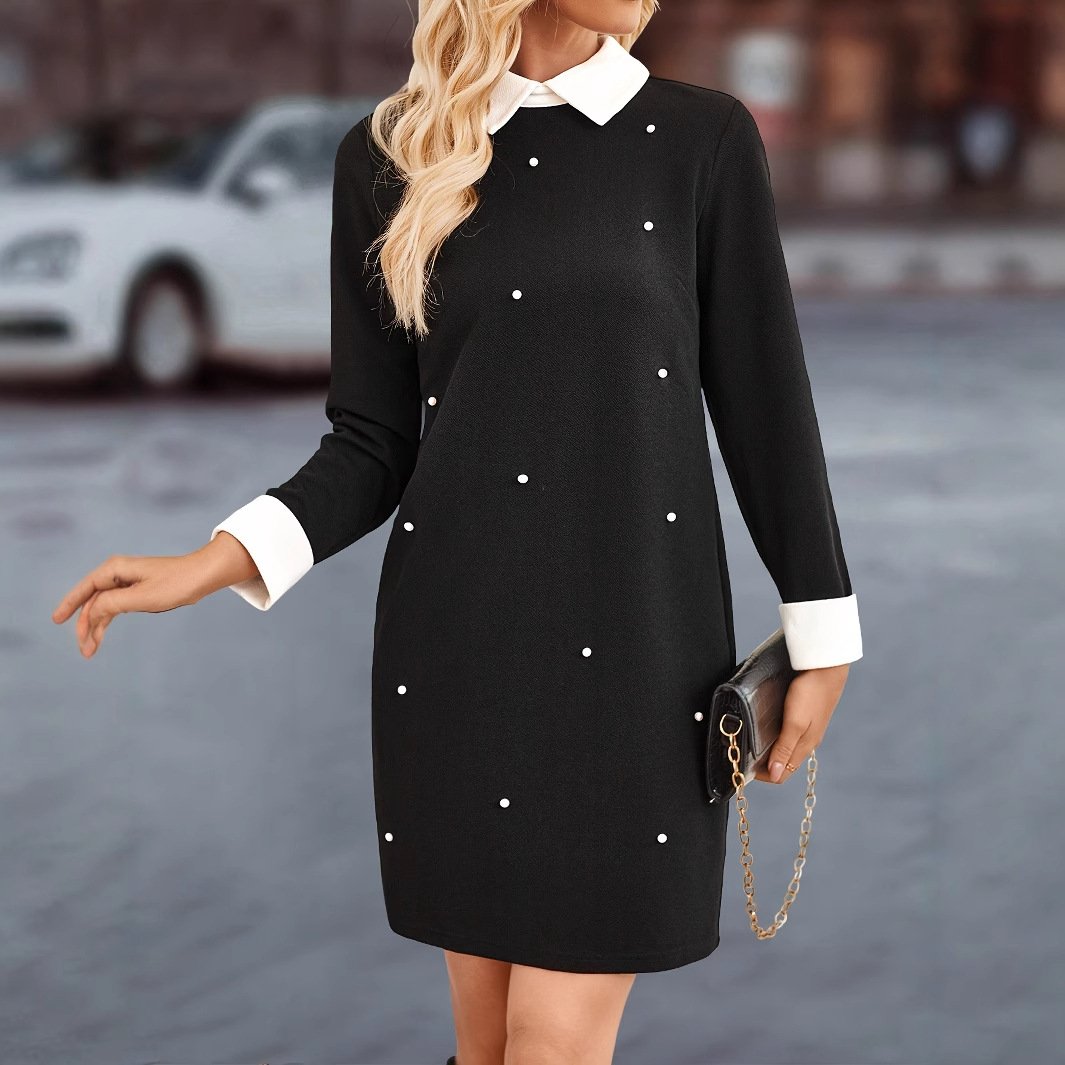 Women’s clothing, solid color beaded casual lapel, knitted long-sleeved temperament dress, high-end feeling