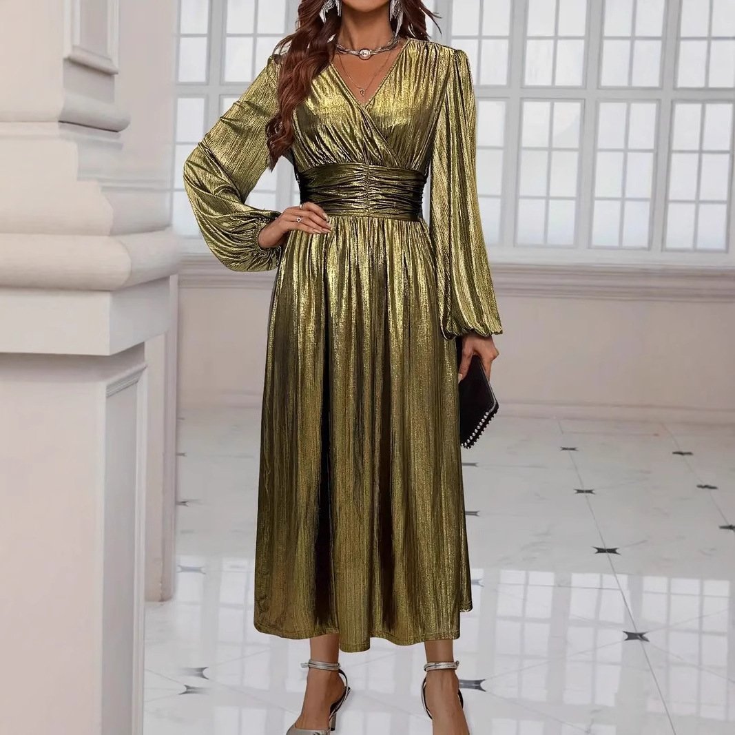 Be the first to review “Women’s elegant and fashionable cross-neck lantern sleeve pleated long skirt spring and autumn slit evening dress”