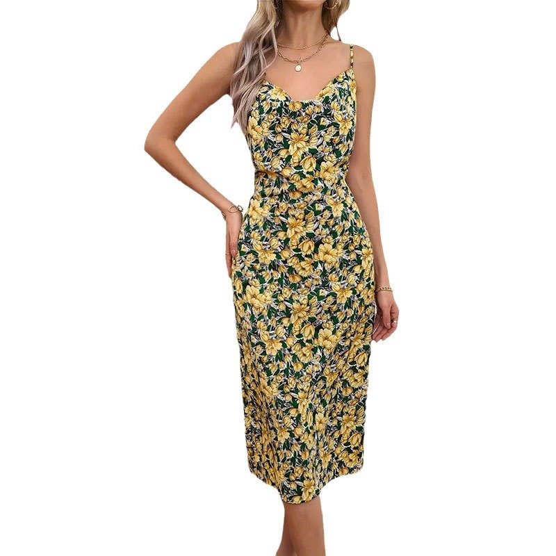 Women’s elegant hanging collar small floral suspender dress printed suspender skirt long skirt