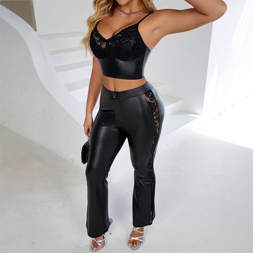 Women’s elegant sexy low-cut spliced ​​lace imitation slim fit stretch trousers two-piece set