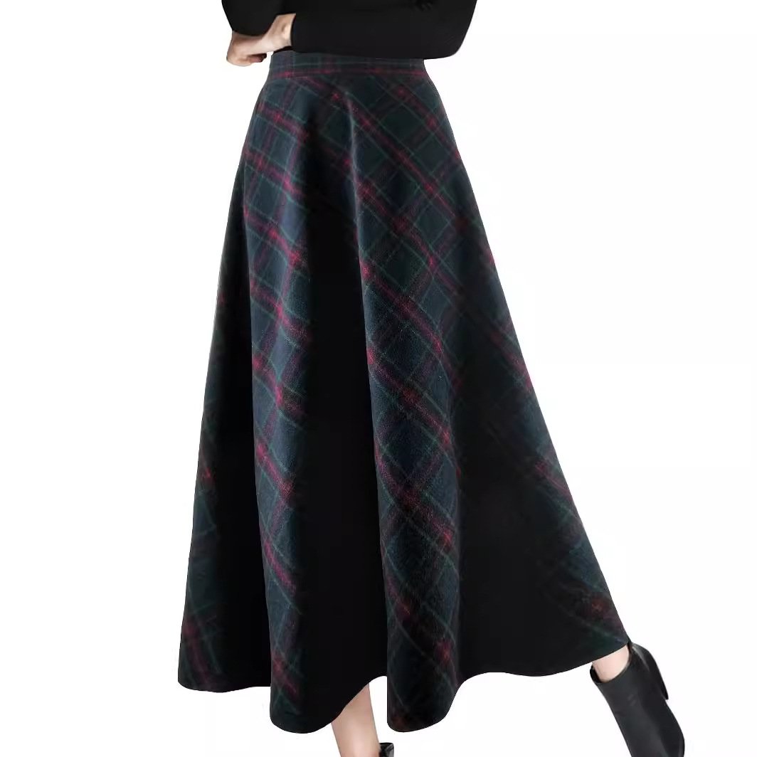 Women’s plaid wool skirt thickened retro skirt high waist long dance skirt women’s skirt