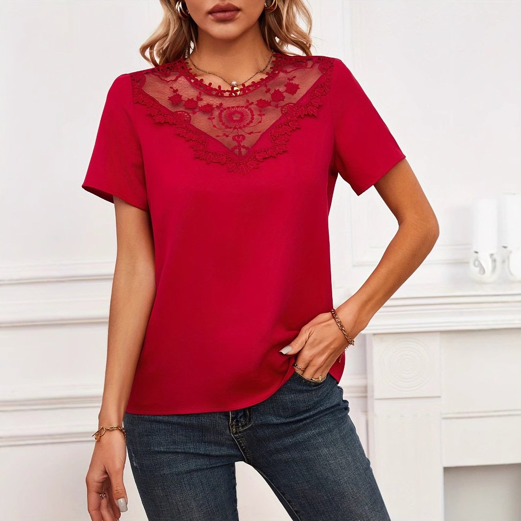 Women’s short-sleeved tops for women’s romantic lace splicing round neck vacation style shirt