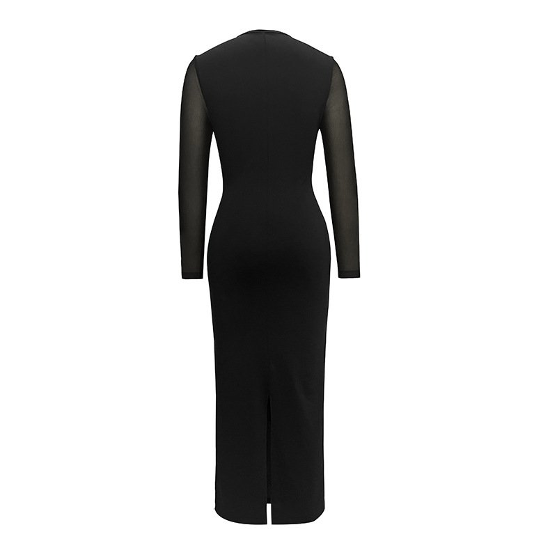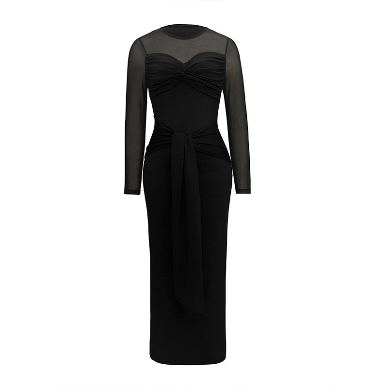 Women’s skirt elegant kink strap mesh splicing perspective round neck long sleeve dress hip-cover skirt
