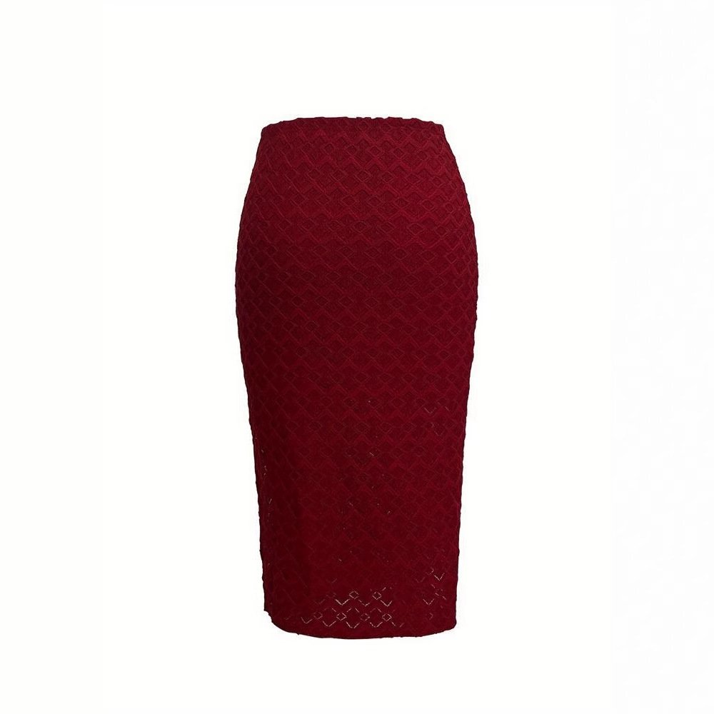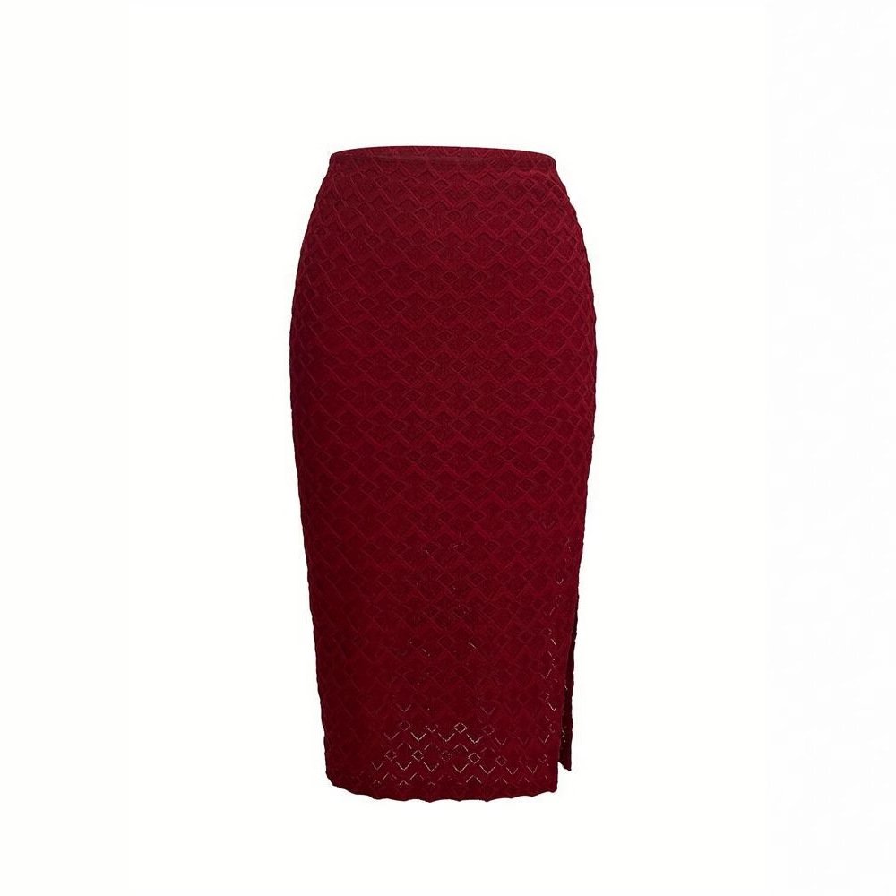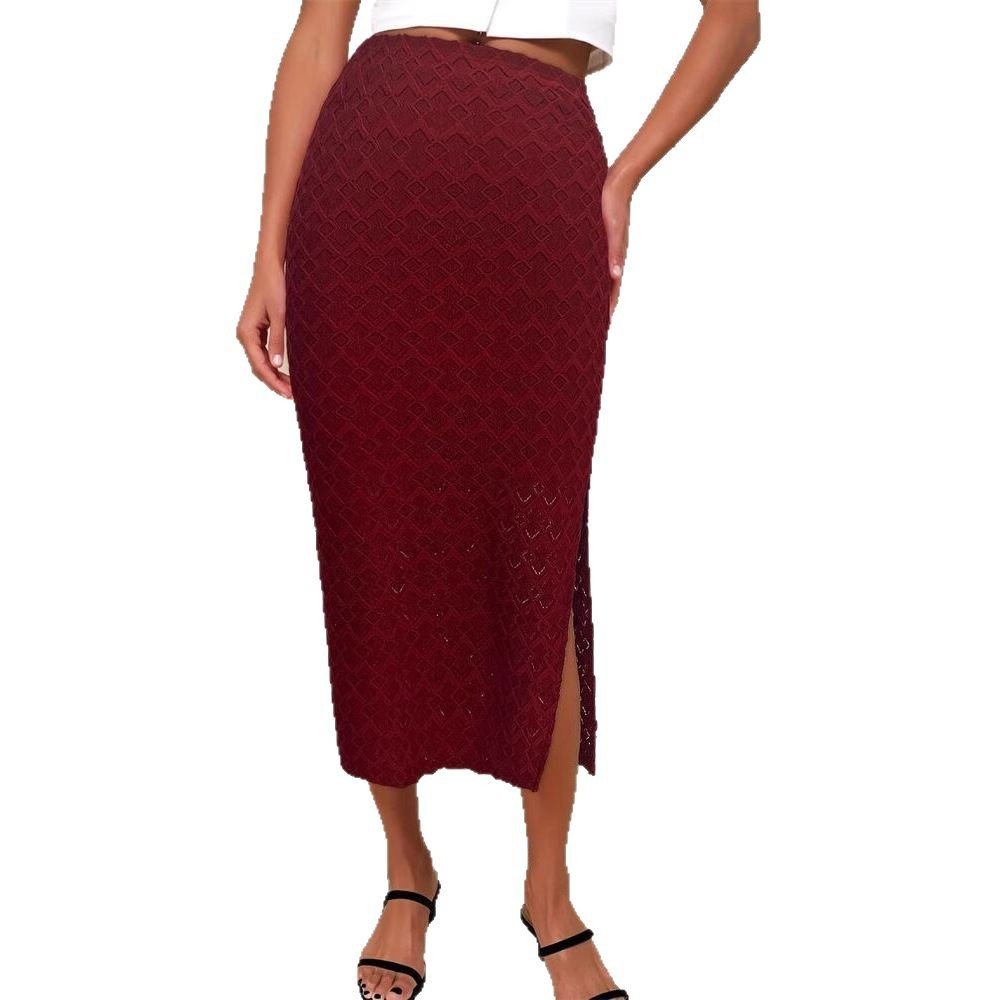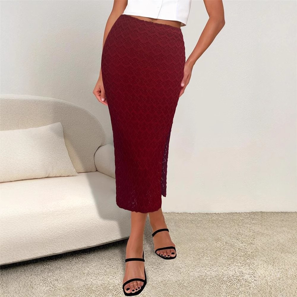 Women’s solid color romantic temperament elastic knitted dark pattern mid-length slit skirt