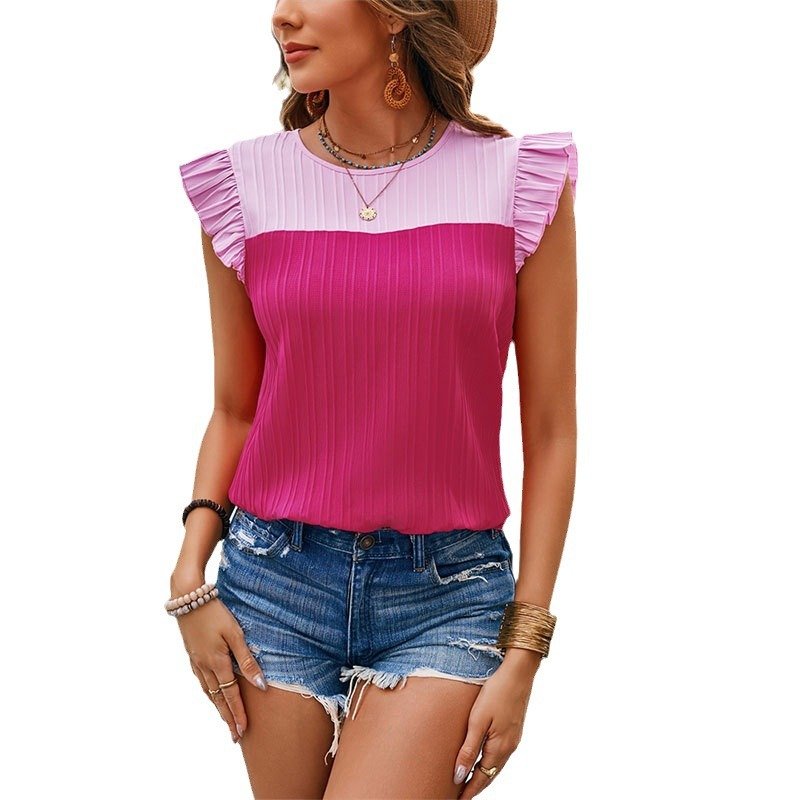 Women’s striped contrasting lotus leaf flying sleeve shirt vacation style ladies sweet style top
