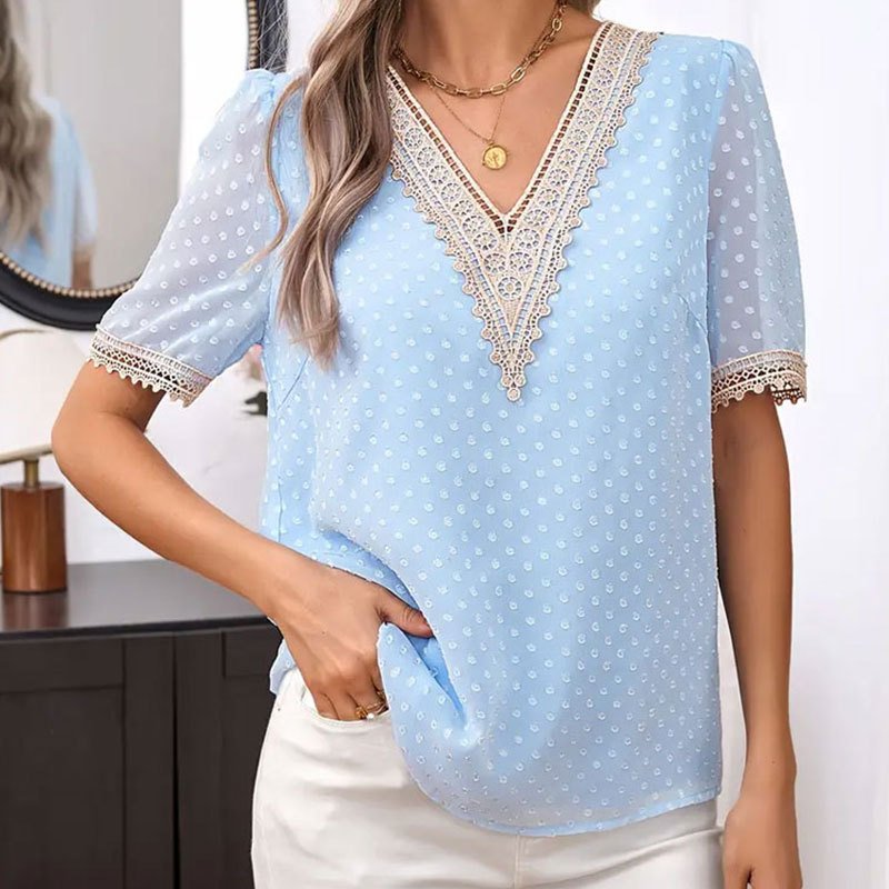Women’s summer elegant commuter lace decoration micro-transparent neck short-sleeved top polka dot mesh shirt